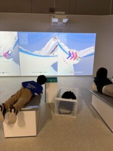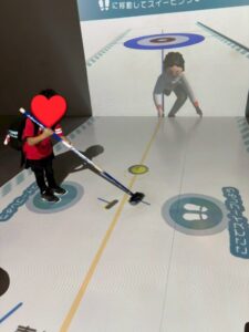 デジタル映像を見ながら体験するエリアが多く、 カーリングやスケルトンなどの動作体験コーナーで